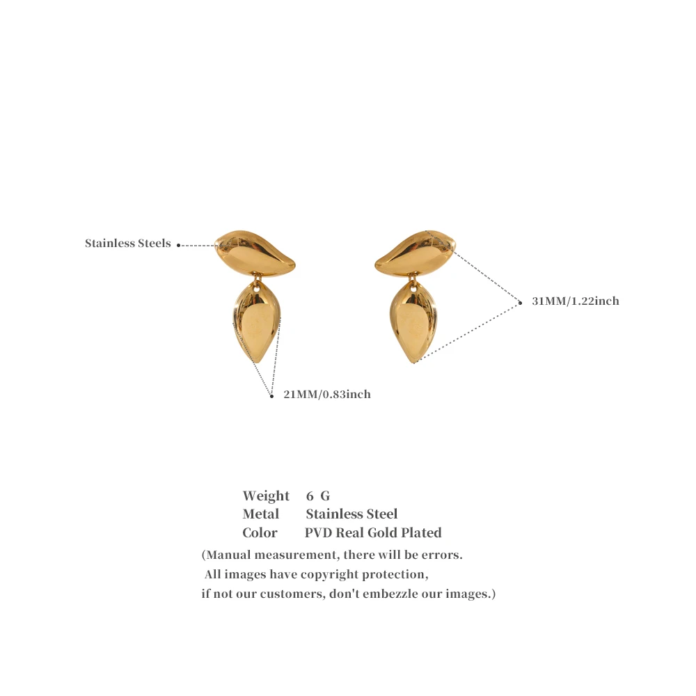 Elevate your jewelry collection with these strikingly modern drop earrings. Featuring a unique, fluid design inspired by organic silhouettes, these earrings consist of two interlocking petal-like elements that catch the light from every angle. The high-shine golden finish and bold sculptural form make them a versatile statement piece, perfect for transitioning from professional daywear to elegant evening looks.