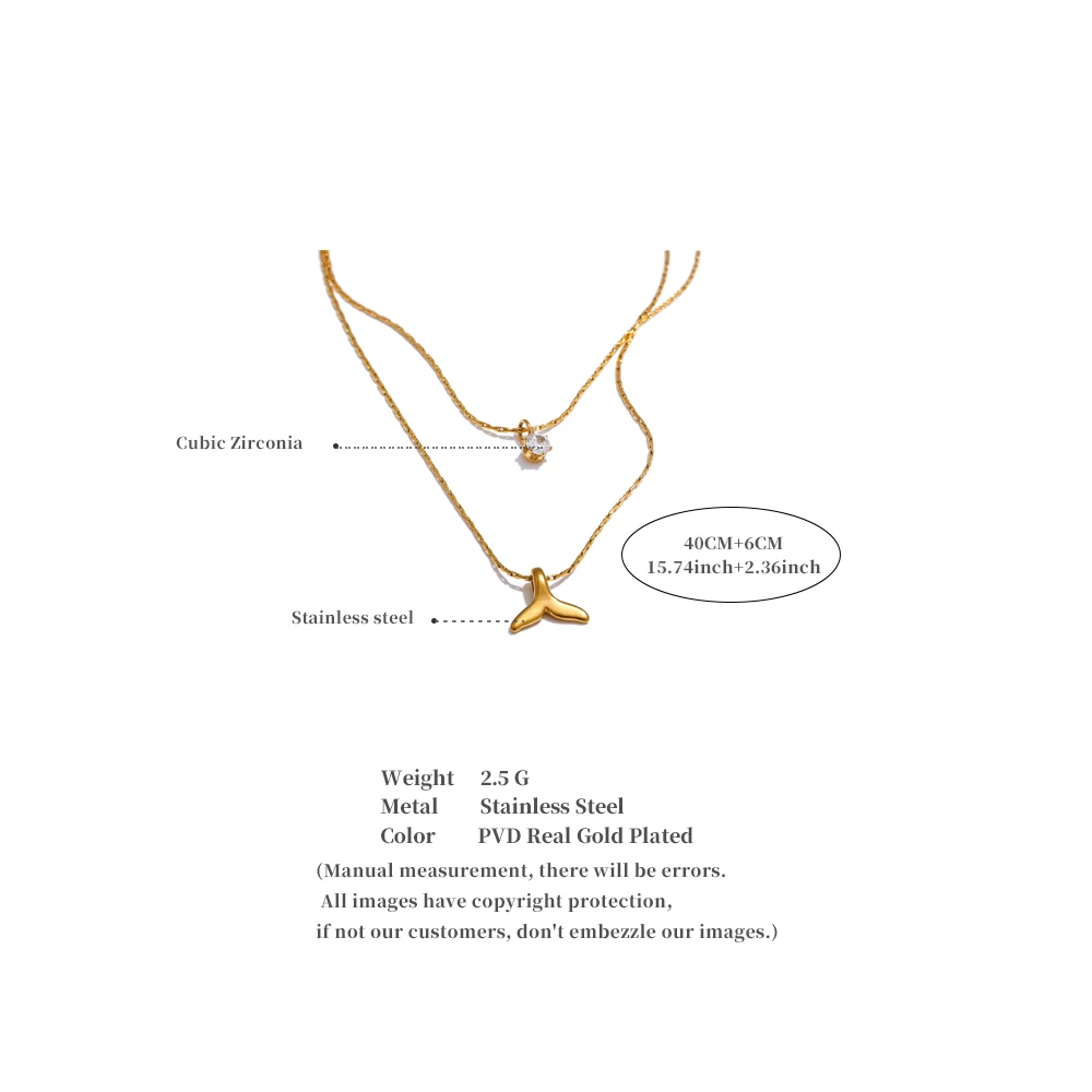 Design: A dual-chain aesthetic featuring a brilliant Cubic Zirconia solitaire on the shorter tier and a sleek Whale Tail pendant on the longer tier, symbolizing grace and freedom.